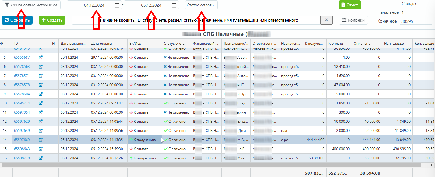 1. Выбираем нужную кассу и настраиваем диапазон дат для отображения проведенных платежей и отображения начального и конечного сальдо