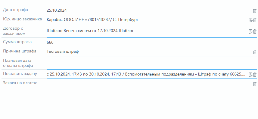 После отправки денежных средств Заказчику и обработки выписки платеж распределяется на счет по штрафу, созданный при утверждении Заявки на платеж